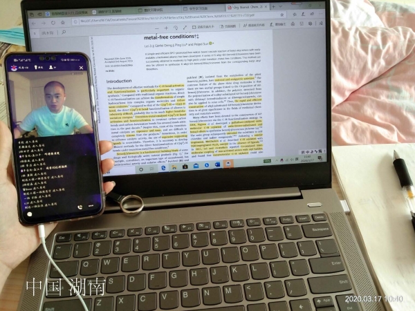 3月17日上午,按照2019级制药工程专业《有机化学》教学内容安排,由我院正在美国阿肯色大学从事博士后科研工作的方波博士为同学们讲解与《有机化学》第二章内容相关英文文献,进行课后知识“加餐”。“大家好,这里是美国当地时间晚上21:50,今天我们一起学习《Organic & Biomolecular Chemistry》上最新发布的研究论文BPO-promoted direct oxidative C–H functionalization of unactivated alkanes into 6-alkyl-6H-benzo[c]chromenes under transition-metal-free conditions,……”。在QQ群课堂直播中,同学们认真听取了方波博士对文献的详细讲解,不断互动,积极提问,并做了详细的笔记。同学们还就美国阿肯色大学校园学习生活等相关问题进行了咨询。