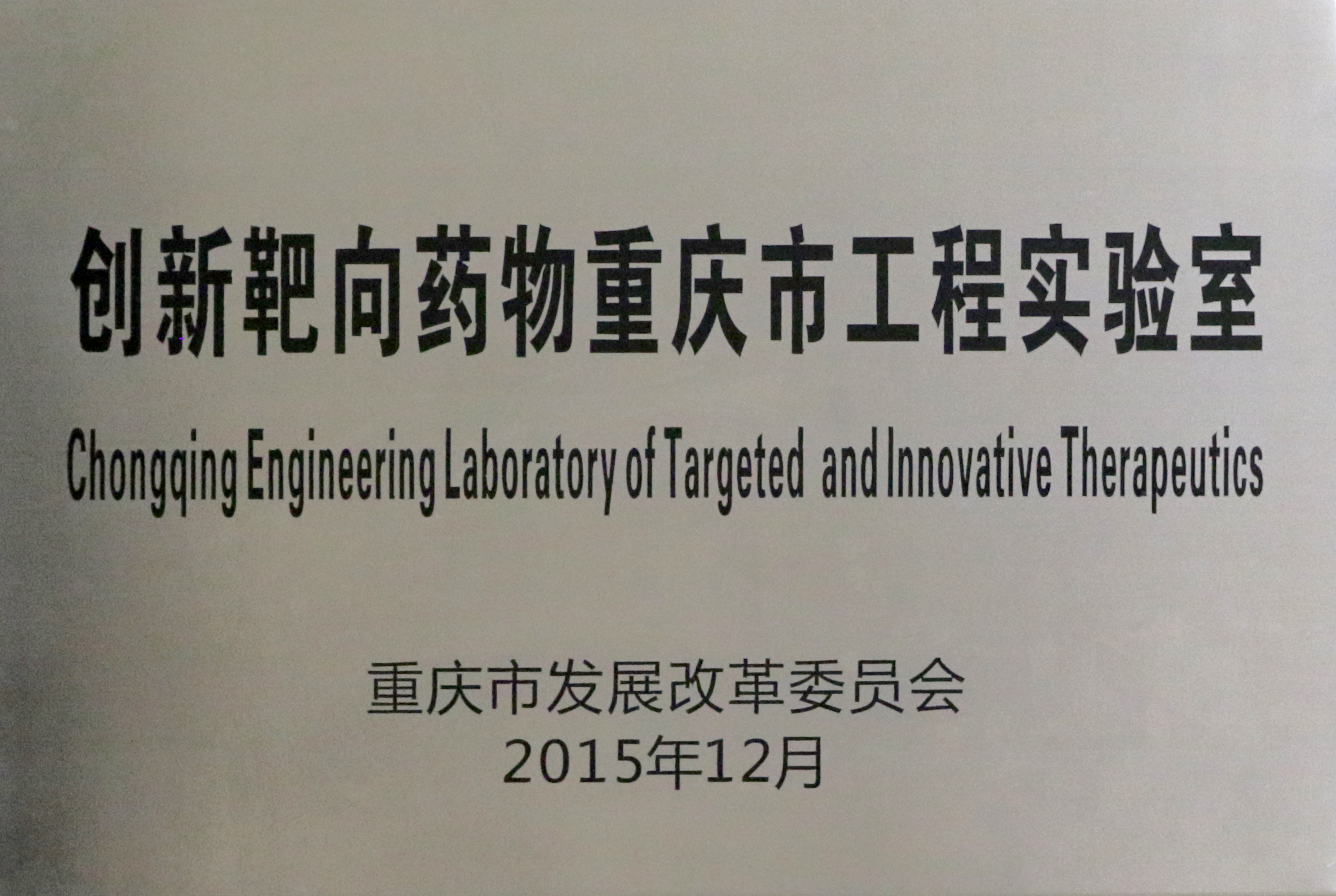 2015年12月,创新靶向药物国际研究院获批重庆市发展与改革委员会创新靶向药物重庆市工程实验室。该实验室为响应国家“十二五规划”和“重大新药创制”专项,立足中国,放眼国际,基于市场进行高效新药开发,打破“me-too”模式,专注于靶向国际新药开发,治疗人类重大疾病,造福人民。